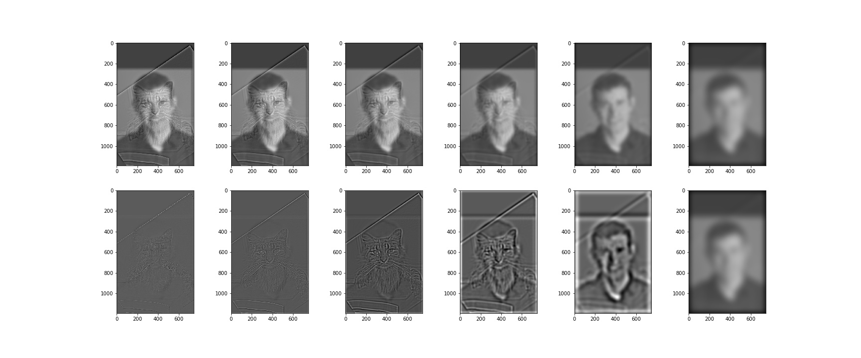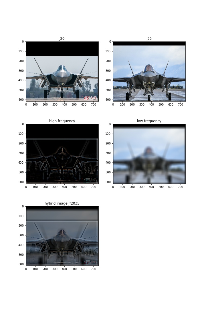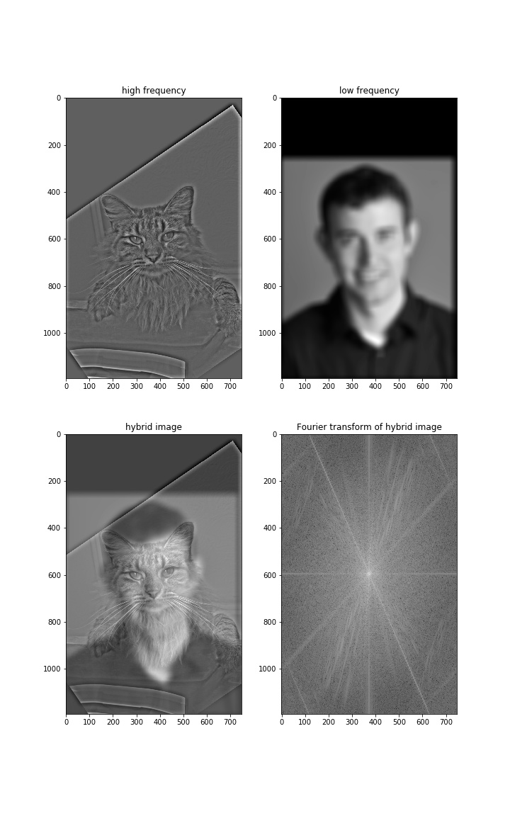 The main idea of hybrid images is to have one image in low frequency and another one in high frequency. So when you look at the image from different distances, you will see two different images.