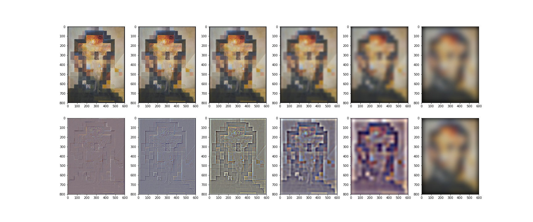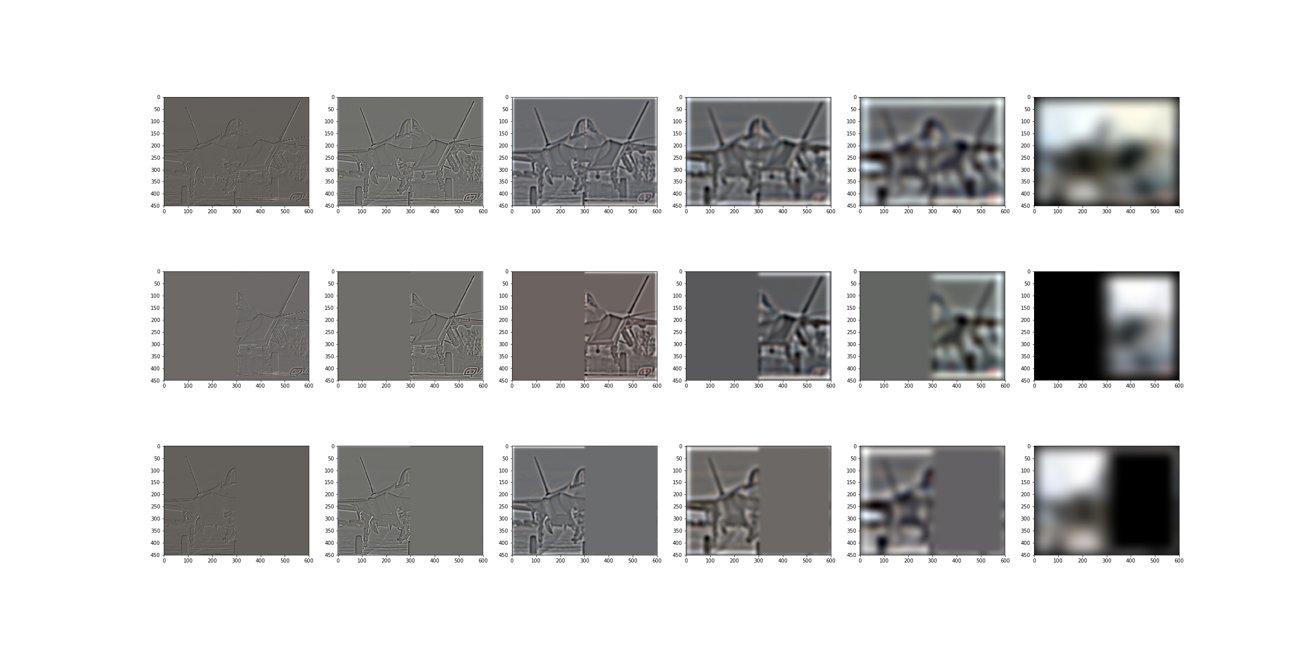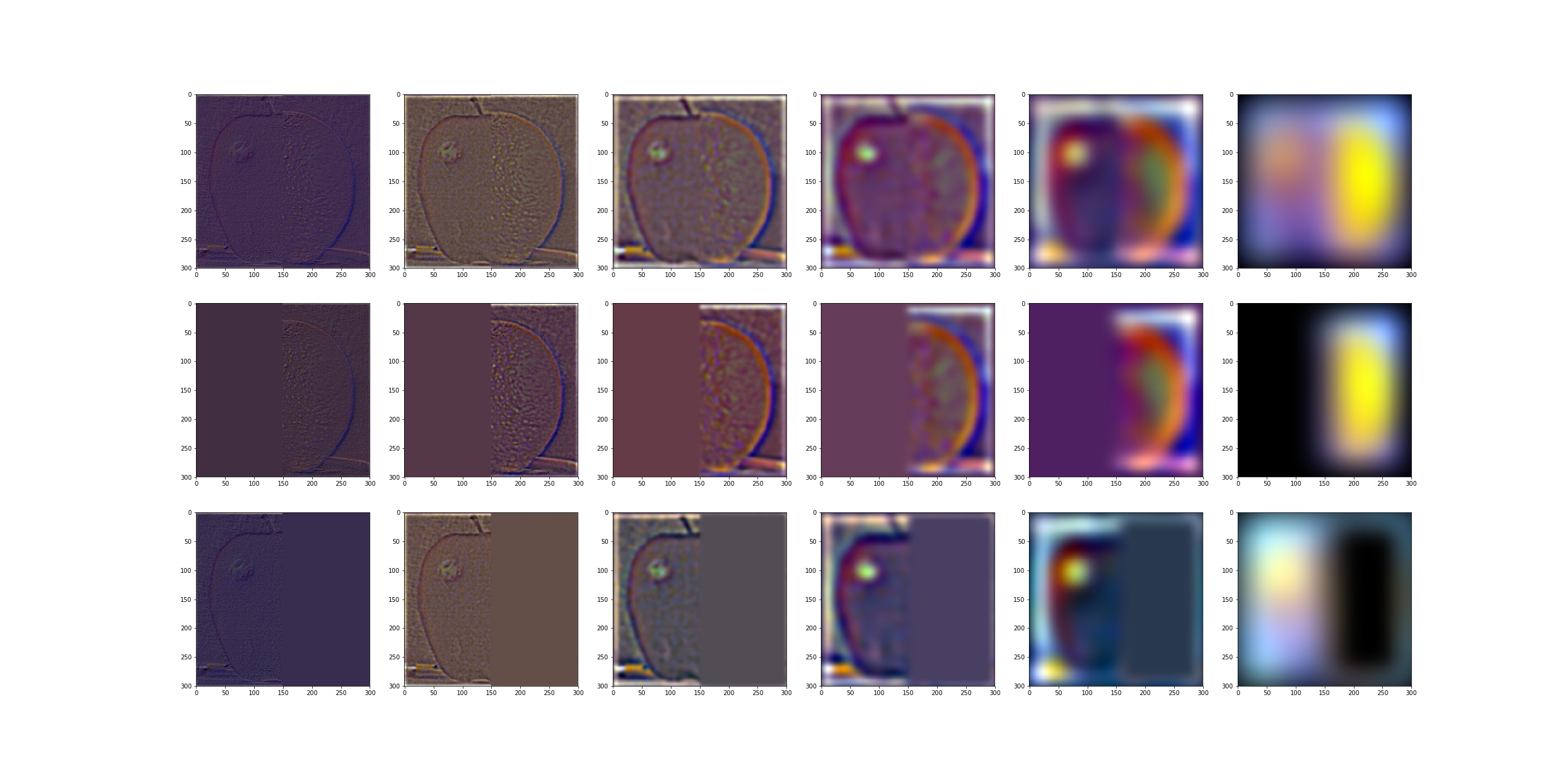 I found that using fixed Gaussian kernel will result in almost invisible laplacian images, so I construct the stack with of Gaussian kernel in a incremental way. Because will become larger, we also need a large size of Gaussian. Instead of using a large size from the beginning, I choose to increment the size of the Gaussian too to save computation. .